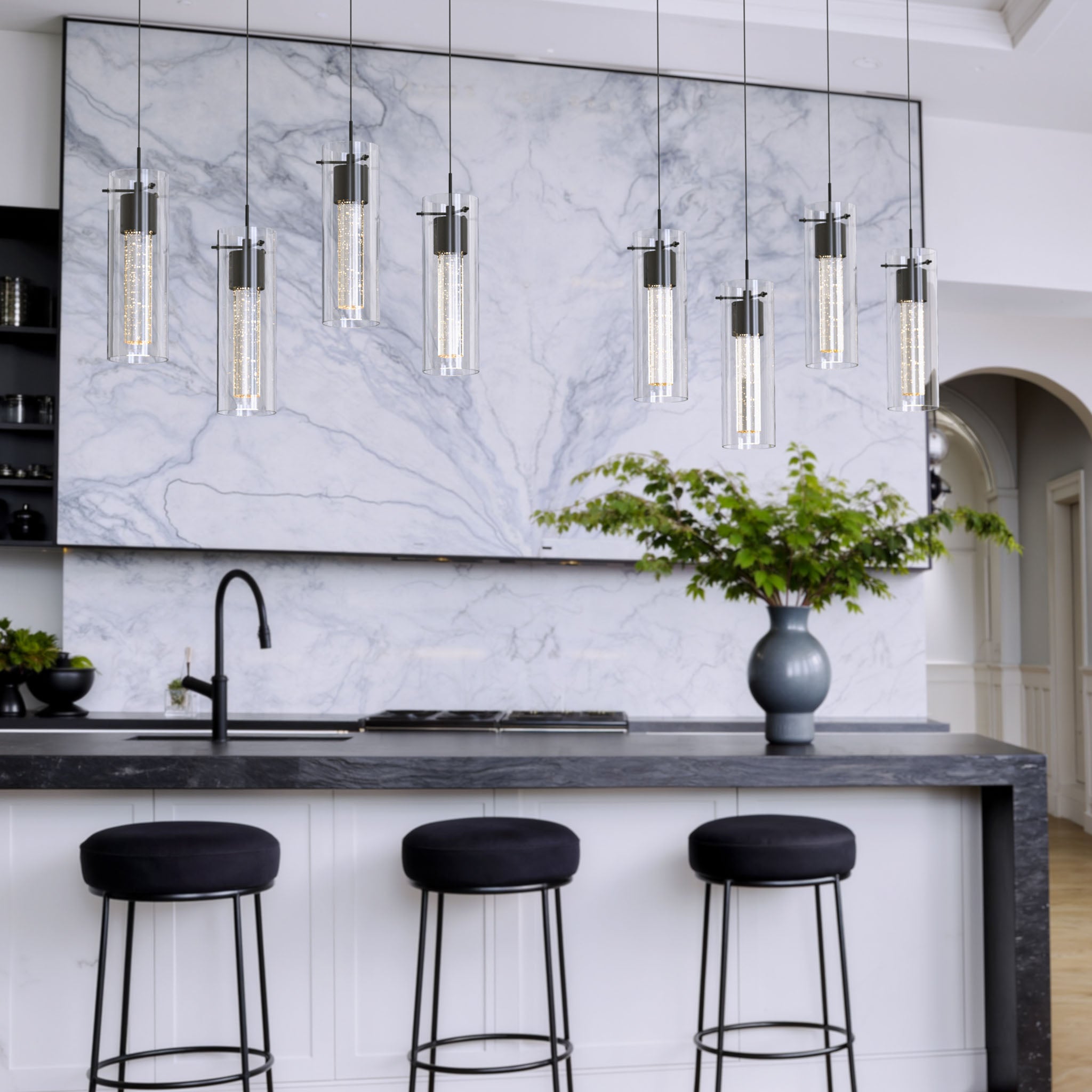 A linear LED pendant featuring four suspended ALICE bubble glass modules in a matte black finish. Clear outer glass surrounds an inner layer of premium bubble glass, delivering soft, evenly diffused illumination across extended surfaces.