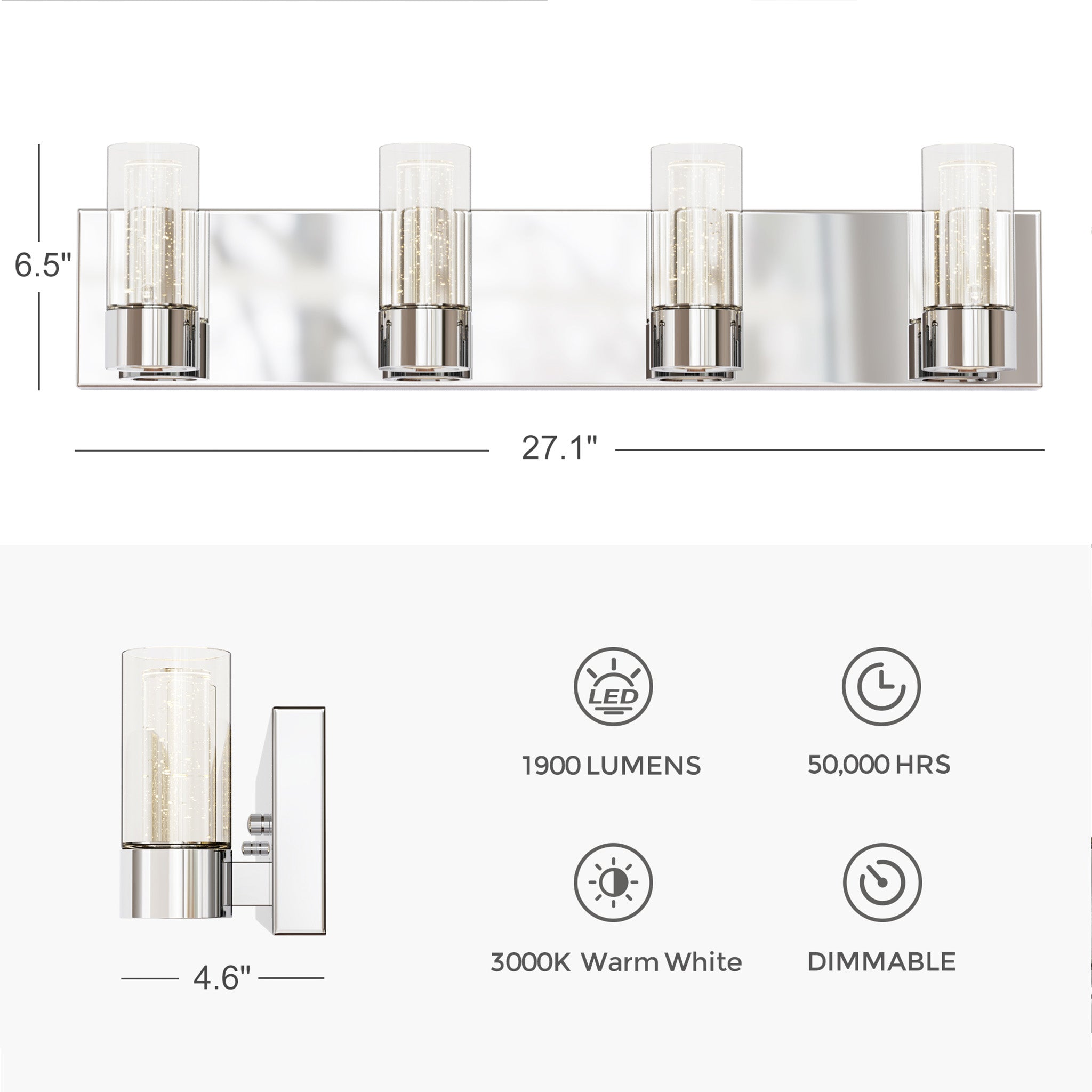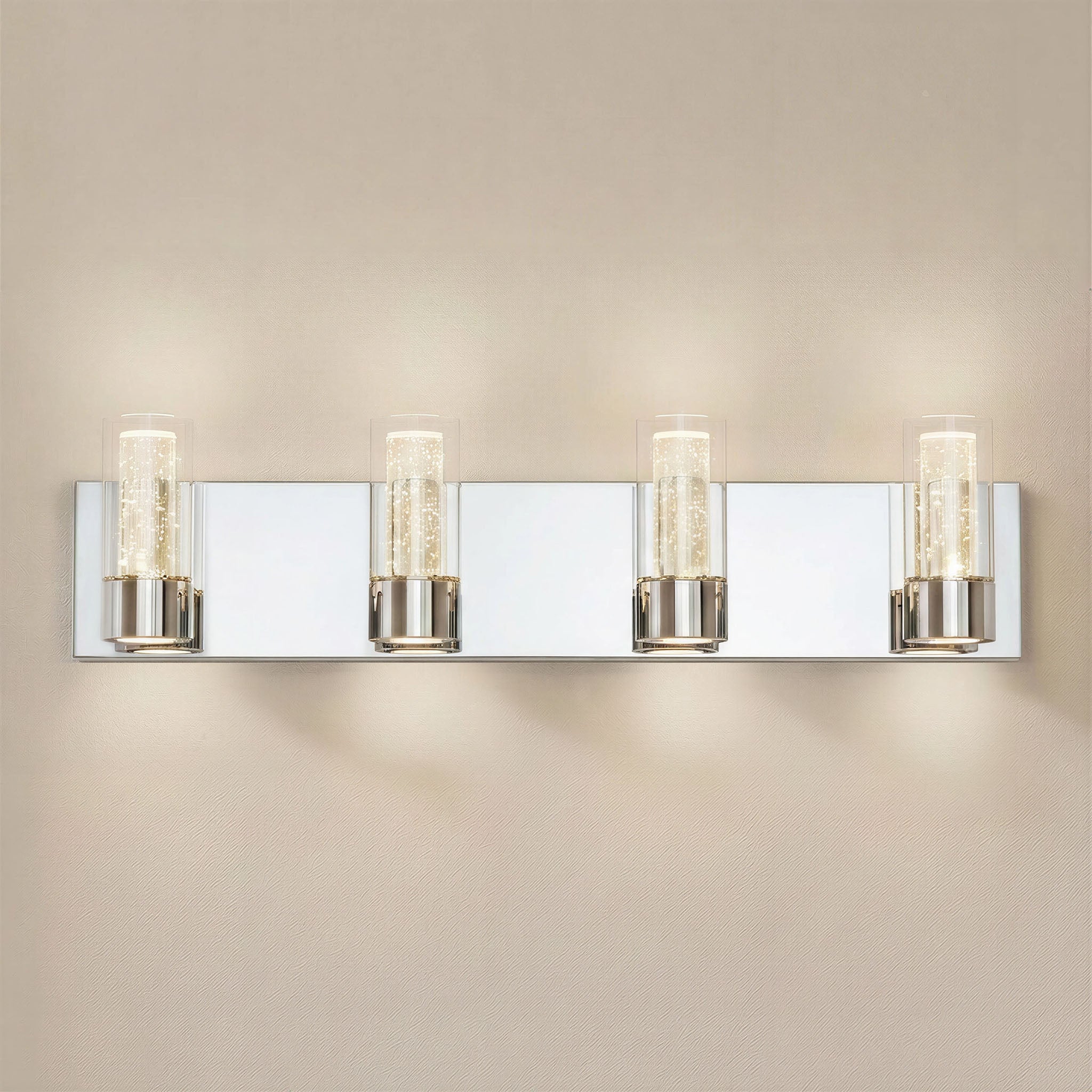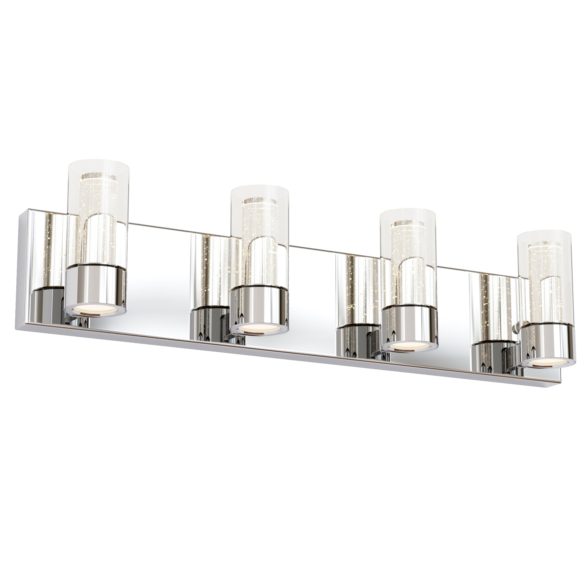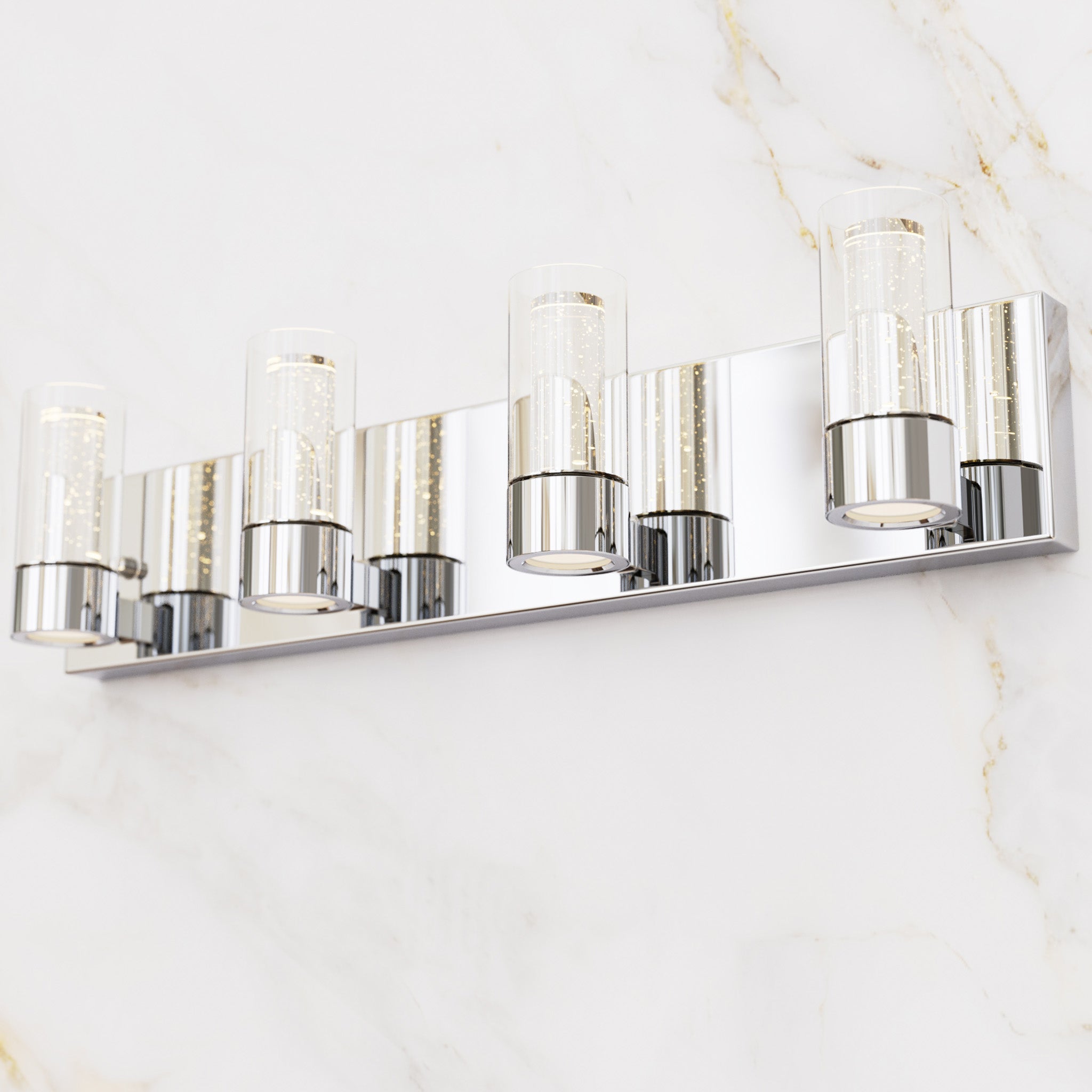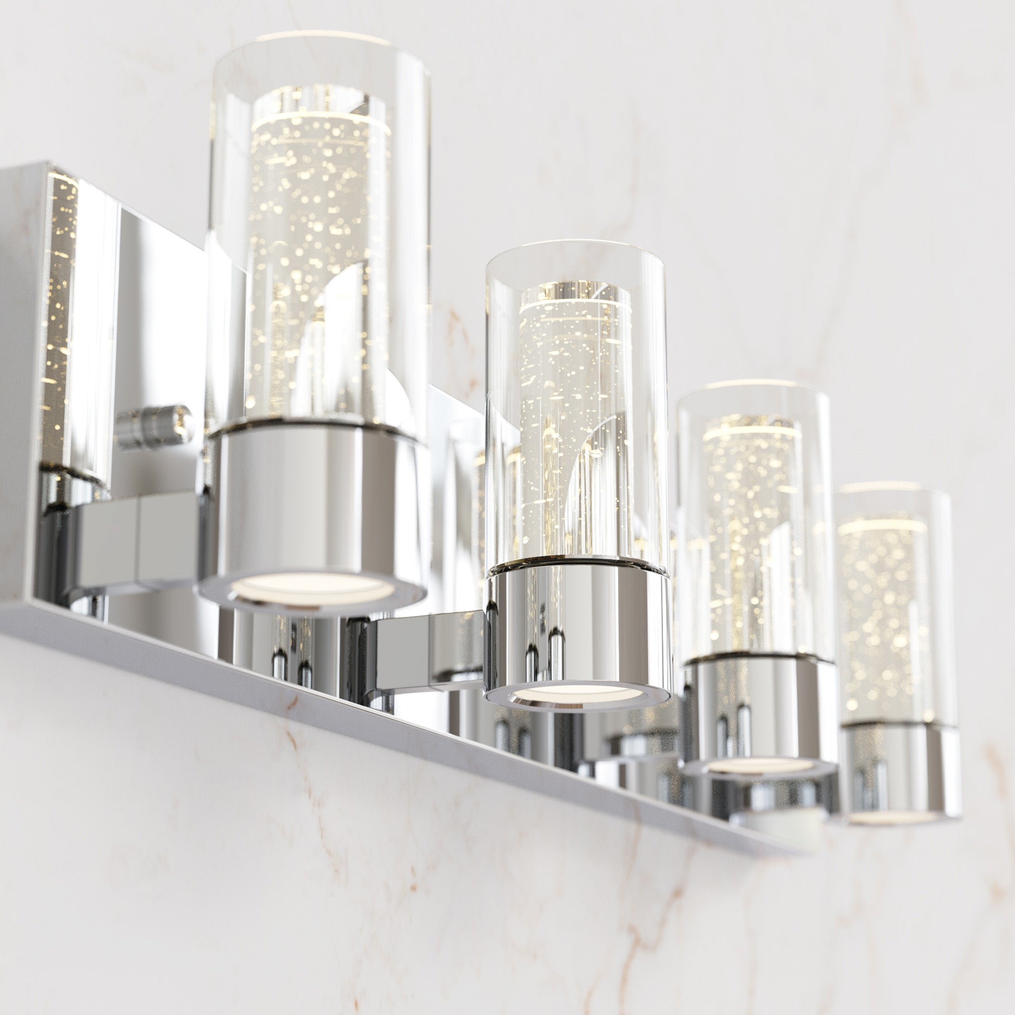 Finished in polished chrome, this modern bathroom fixture features clear outer glass cylinders paired with premium inner bubble glass that creates a sparkling, dimensional lighting effect.