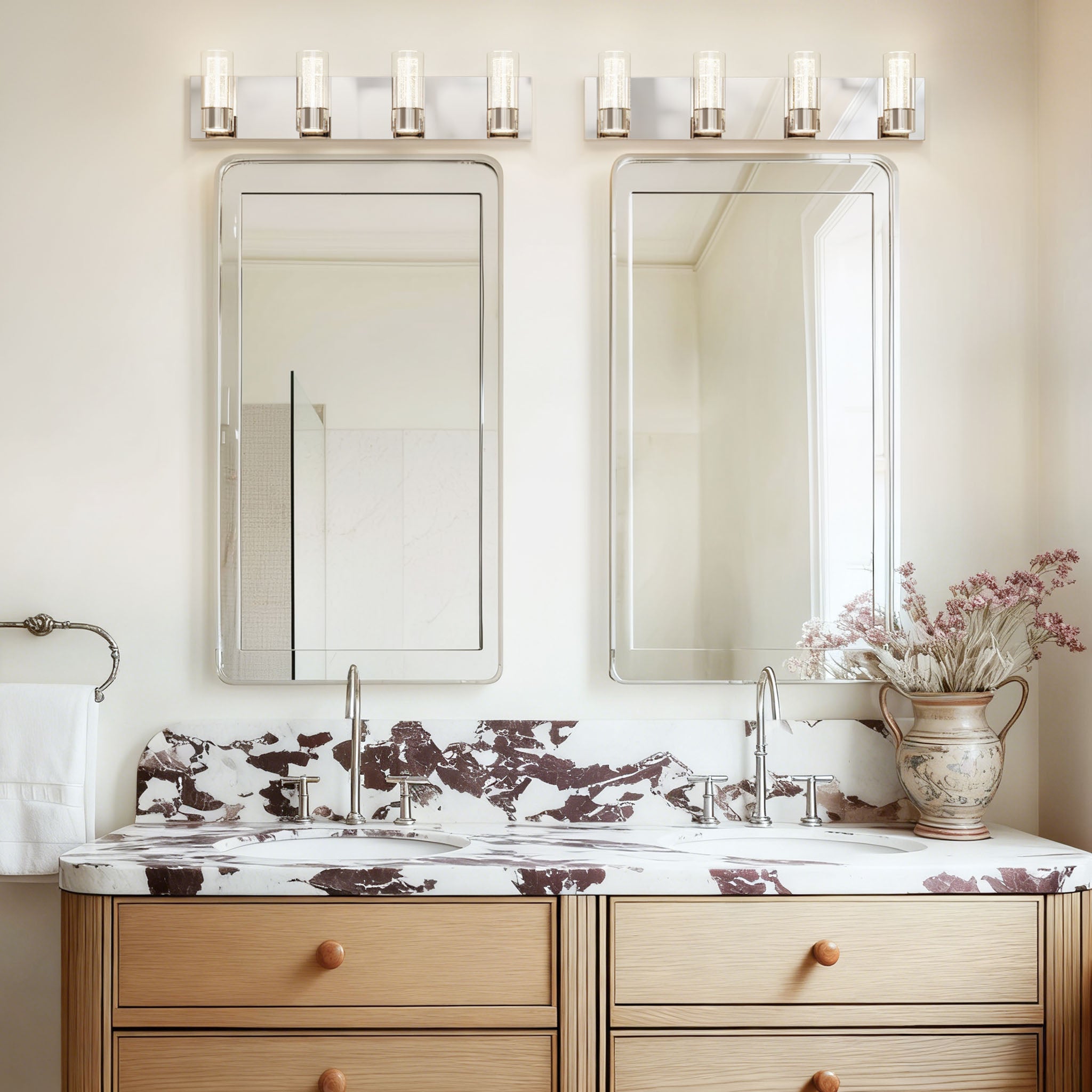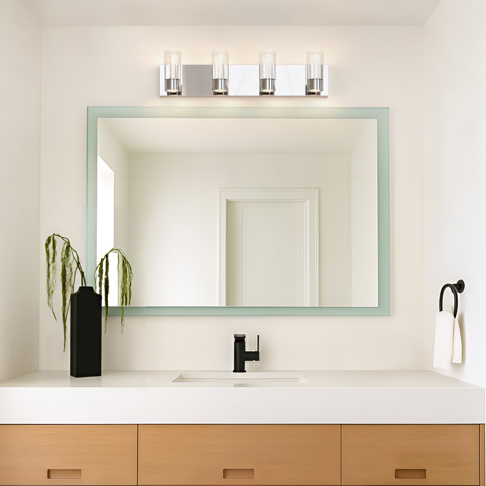 Perfect for installation above double vanities or wide bathroom mirrors, the four-light configuration provides even, balanced illumination ideal for daily grooming and makeup application.