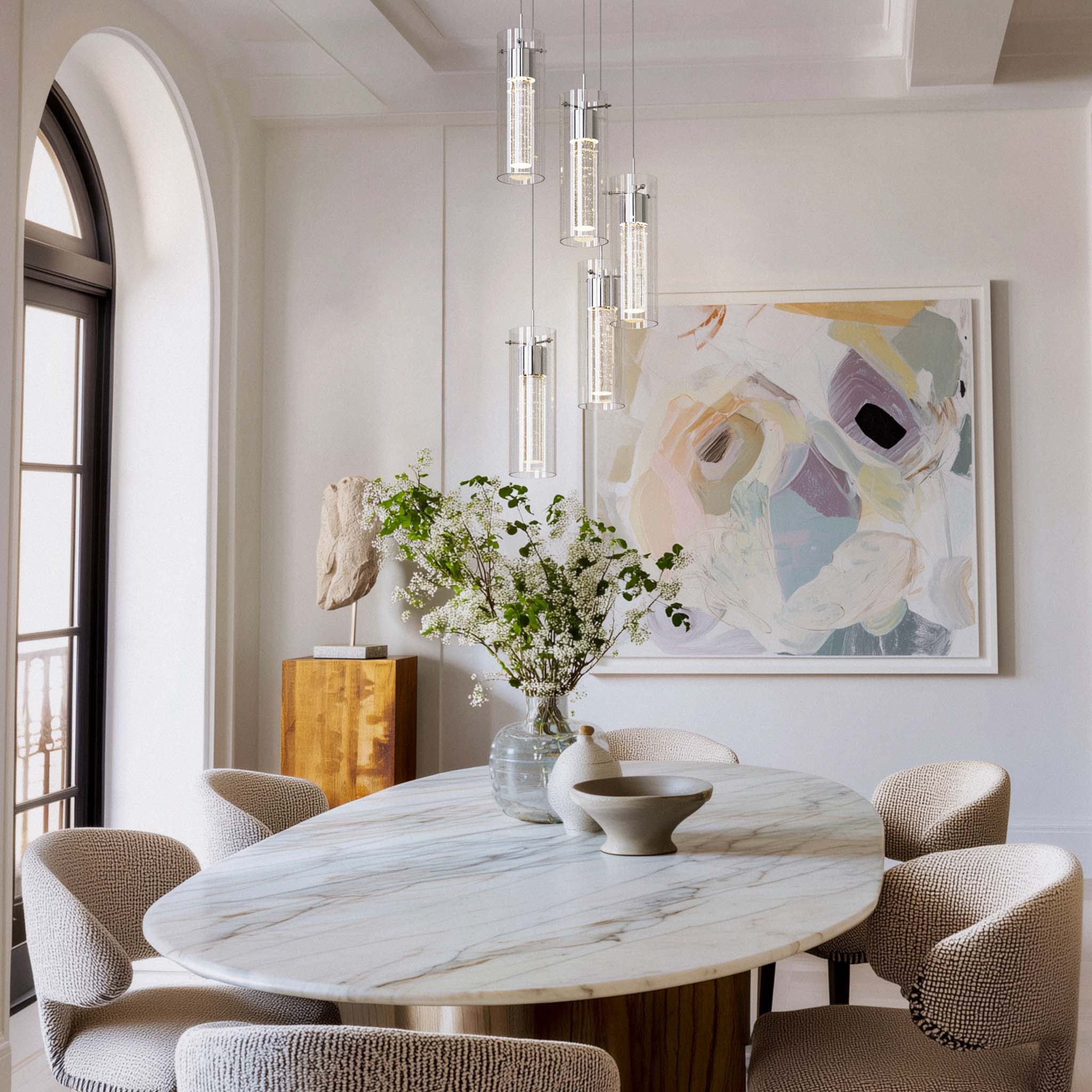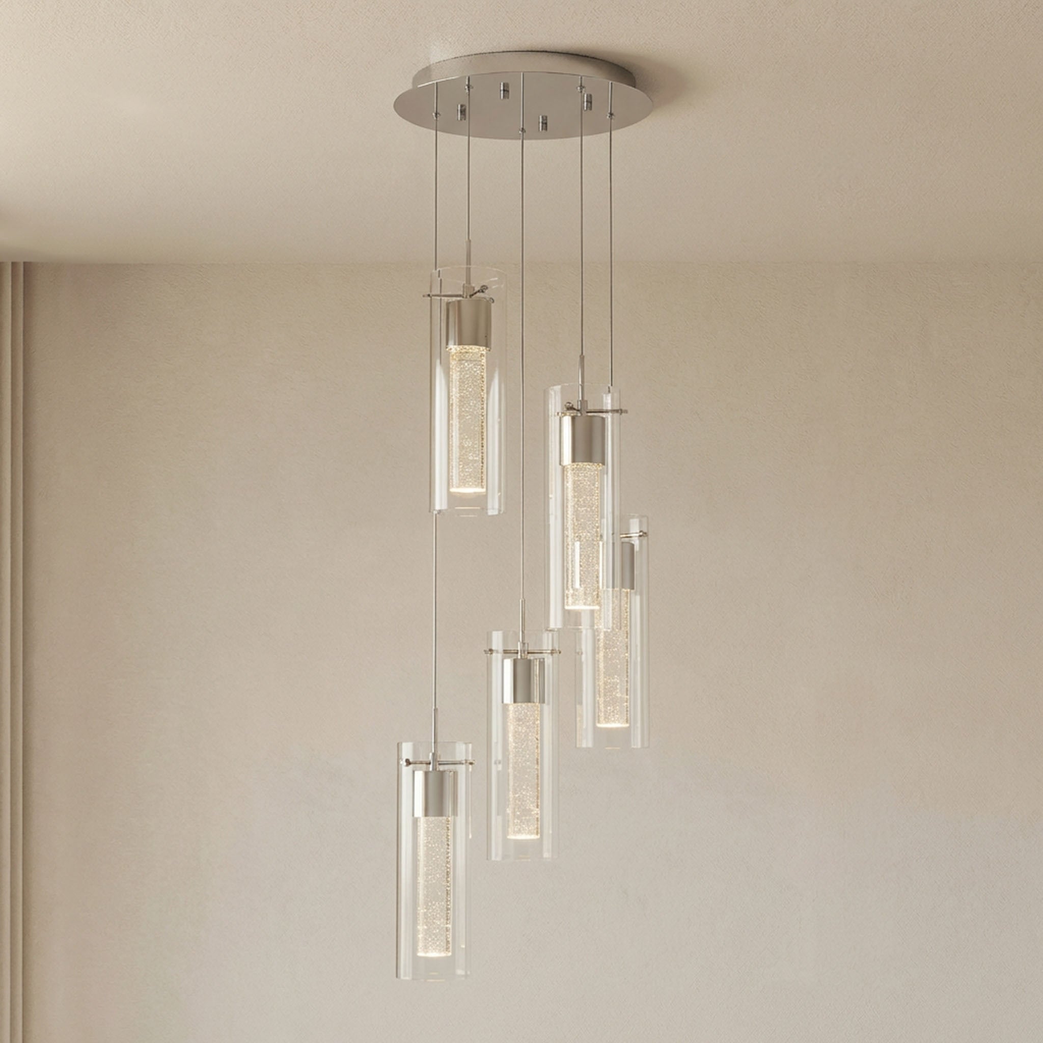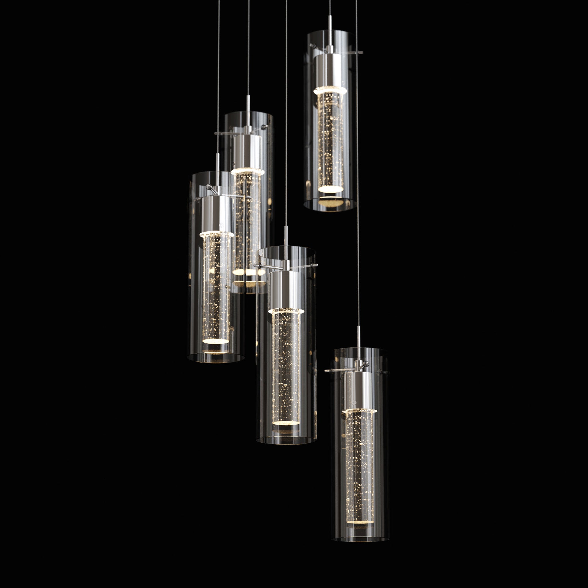 Finished in polished chrome, each pendant features a double-layer glass construction: a clear outer cylinder paired with a premium bubble glass core that softly refracts the integrated LED light. The result is a luminous texture that feels refined yet expressive, adding depth without visual heaviness.