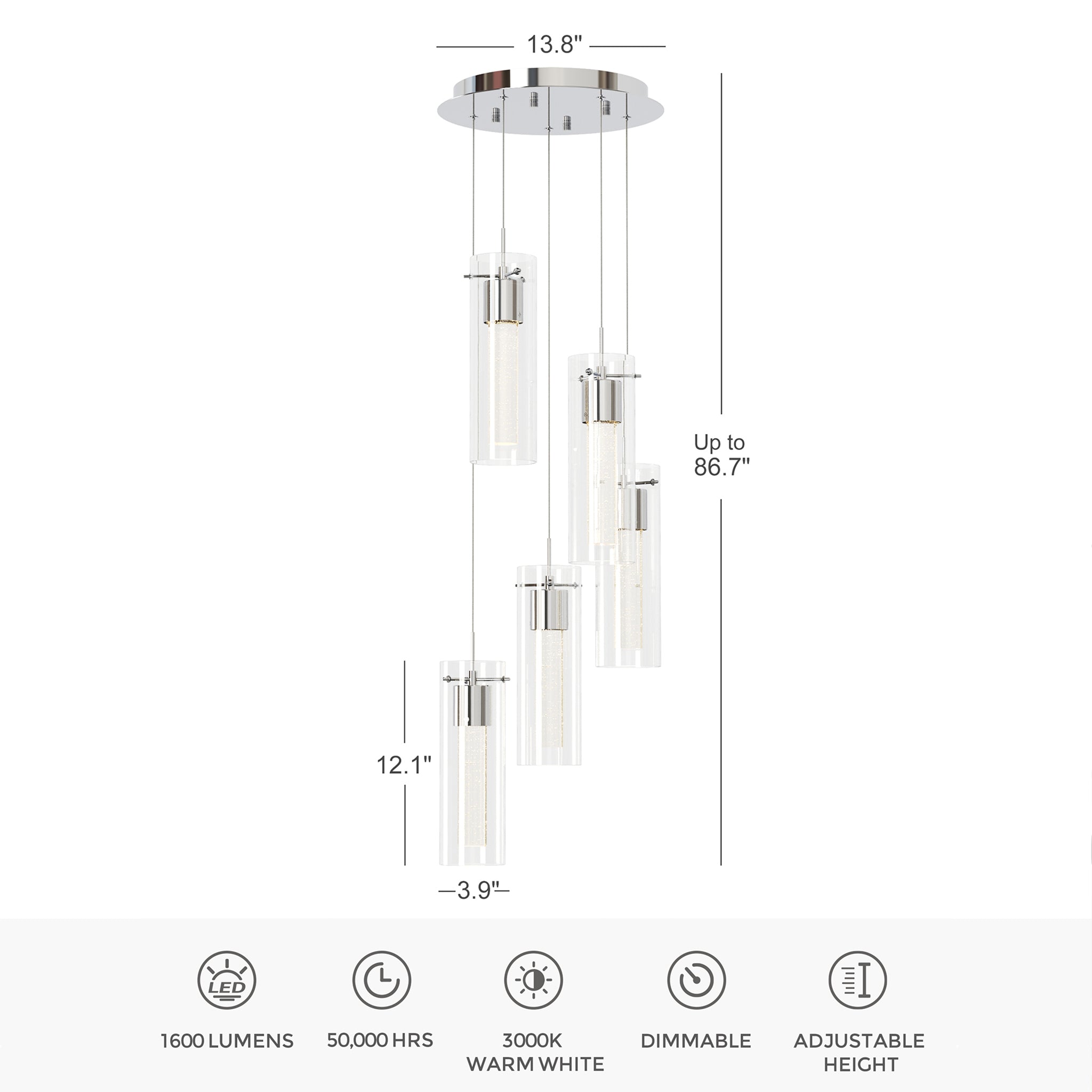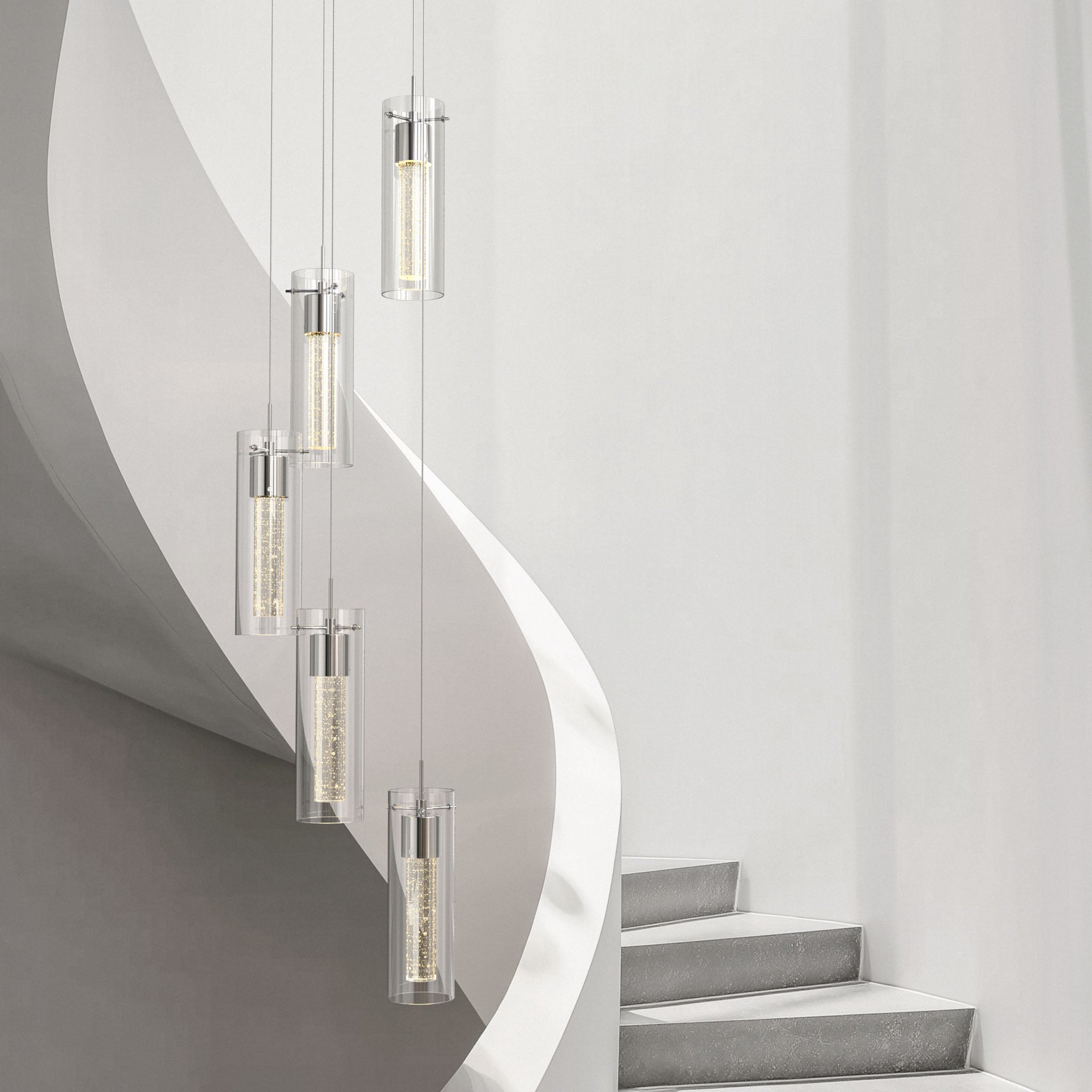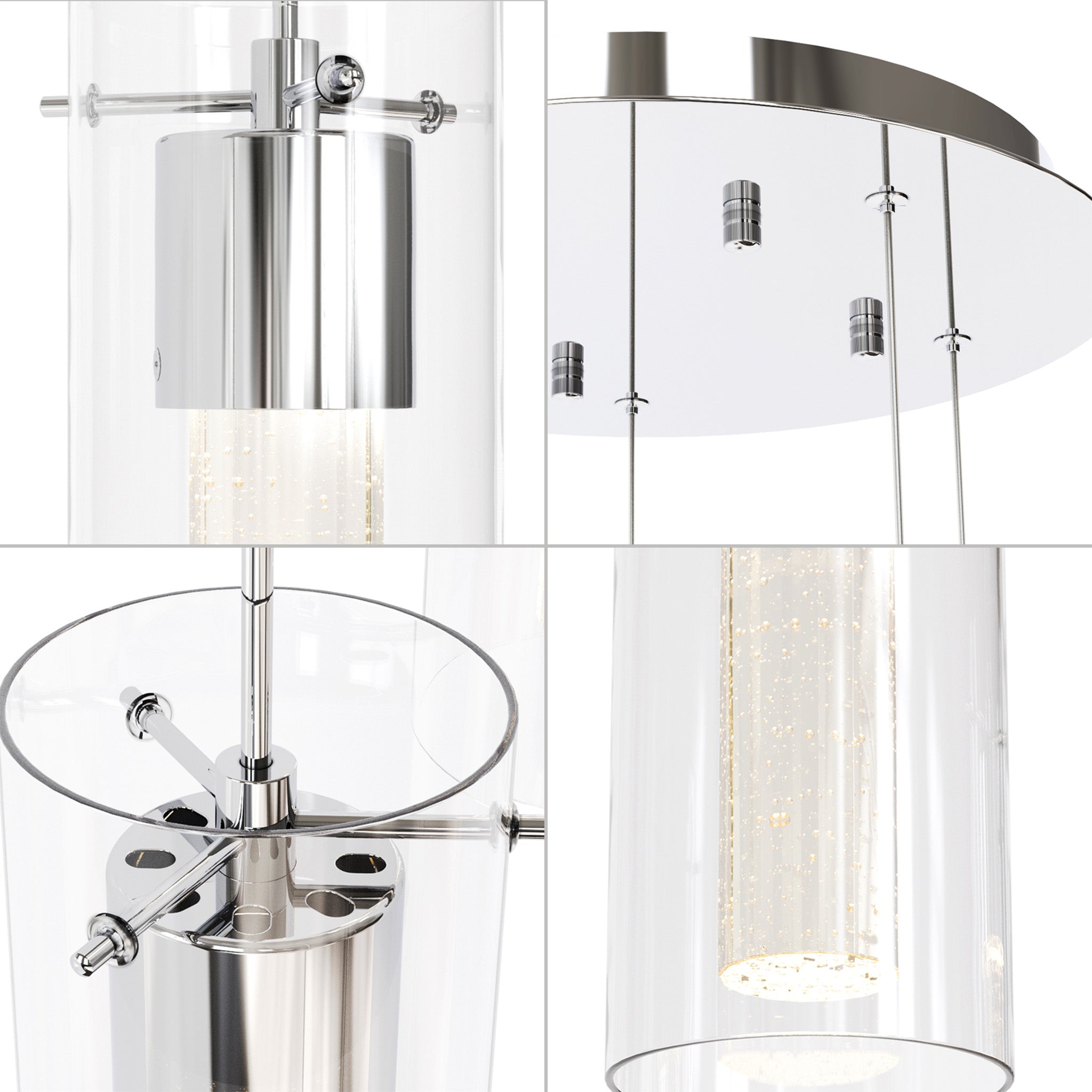 Finished in polished chrome, each pendant features a double-layer glass construction: a clear outer cylinder paired with a premium bubble glass core that softly refracts the integrated LED light. The result is a luminous texture that feels refined yet expressive, adding depth without visual heaviness.