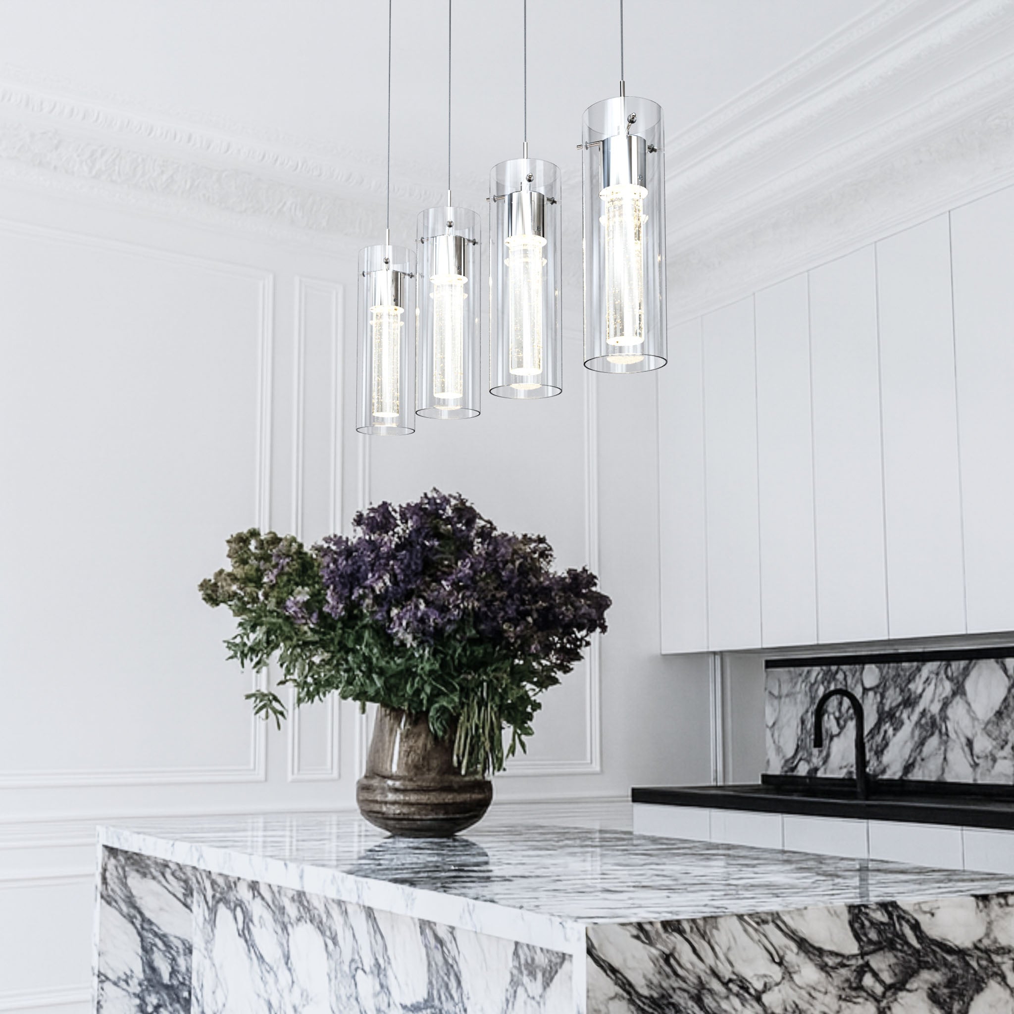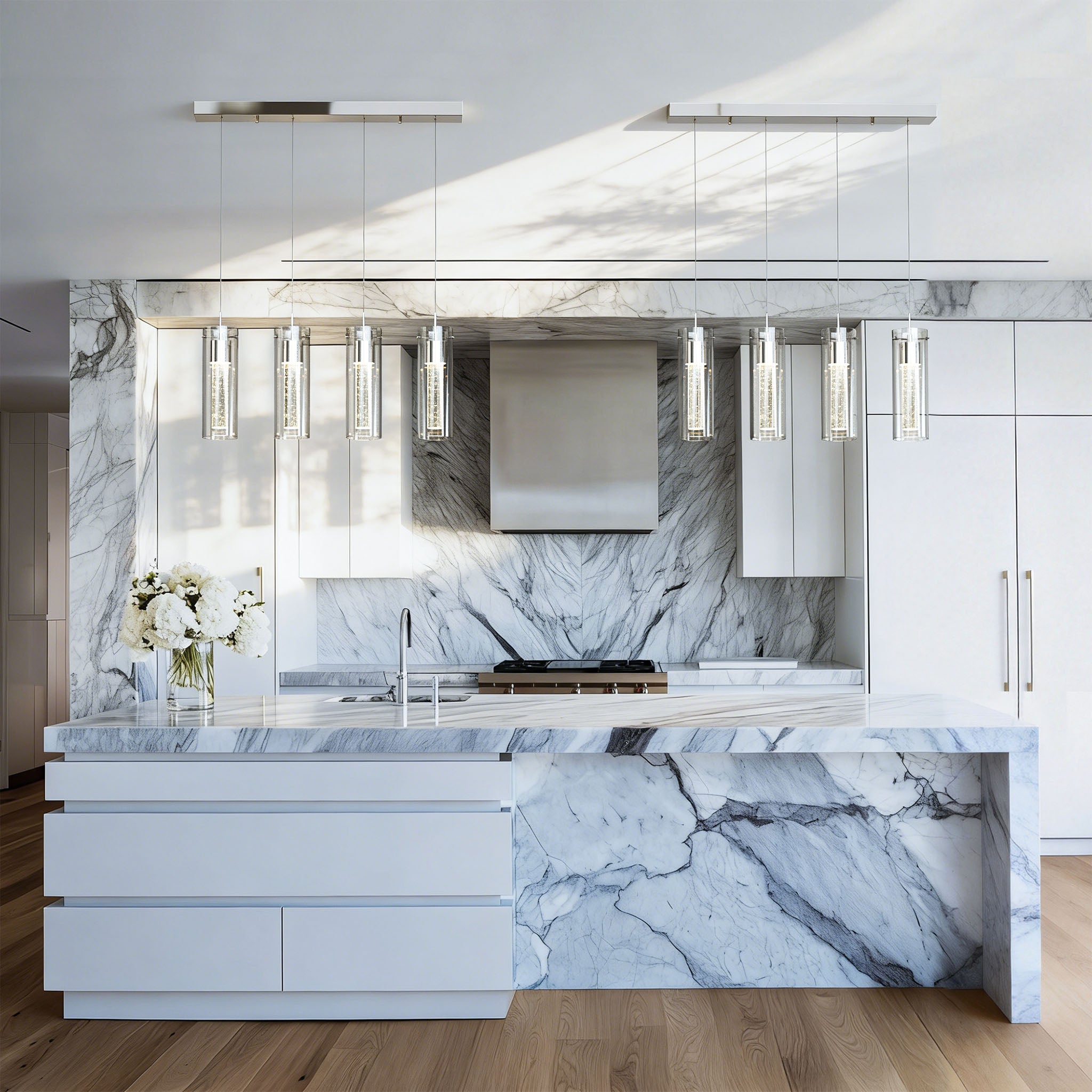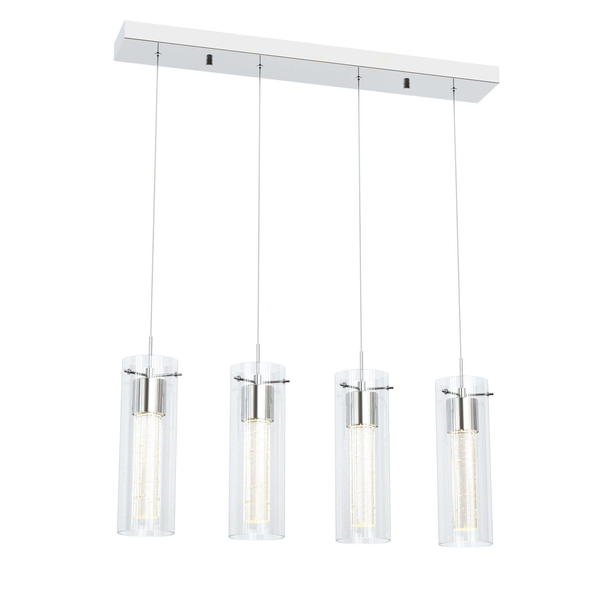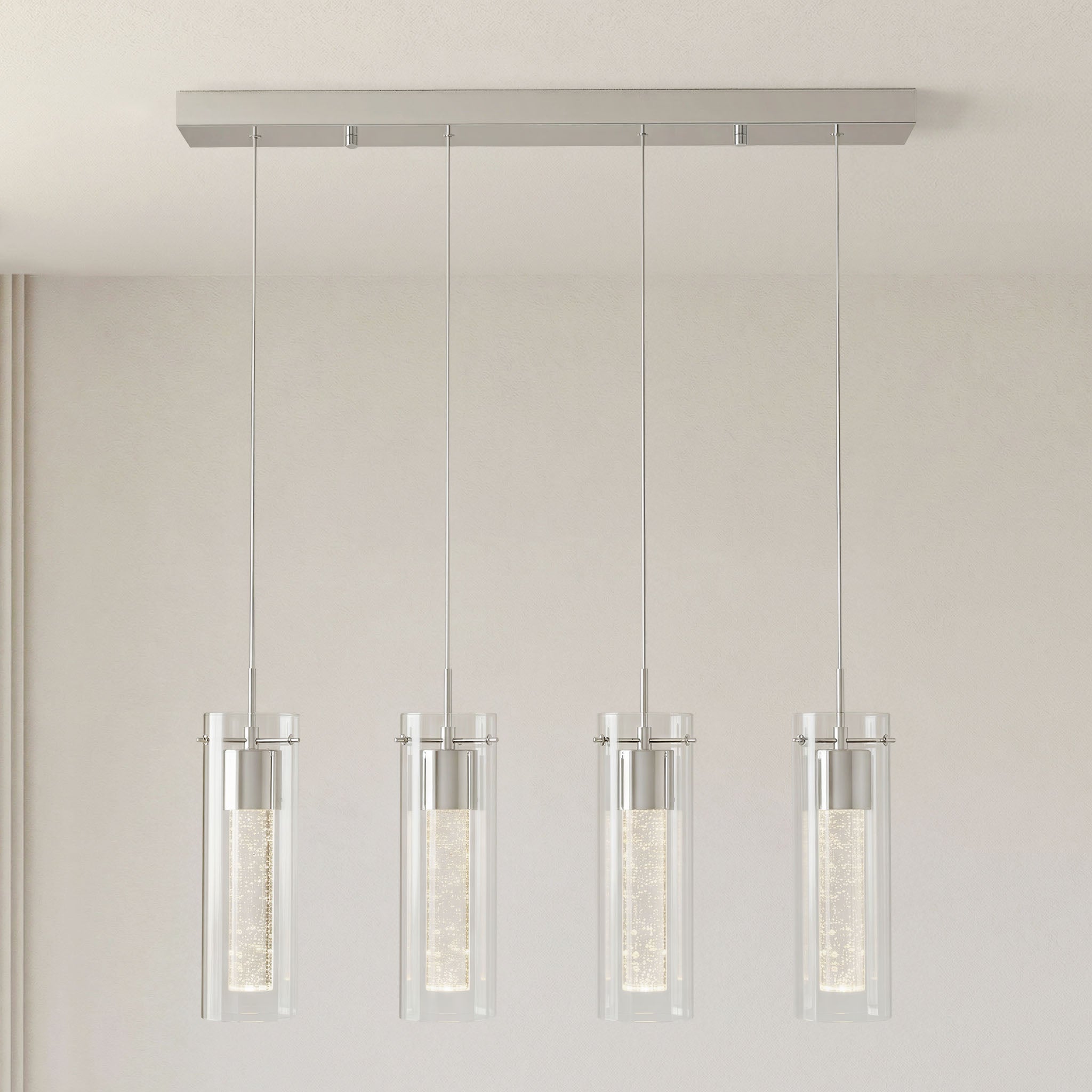 Designed for modern interiors seeking clean architectural lines and luminous depth. Finished in elegant polished chrome, this linear island fixture features a dual-glass construction with a clear outer cylinder and a premium bubble glass inner core, creating layered illumination with visual texture.