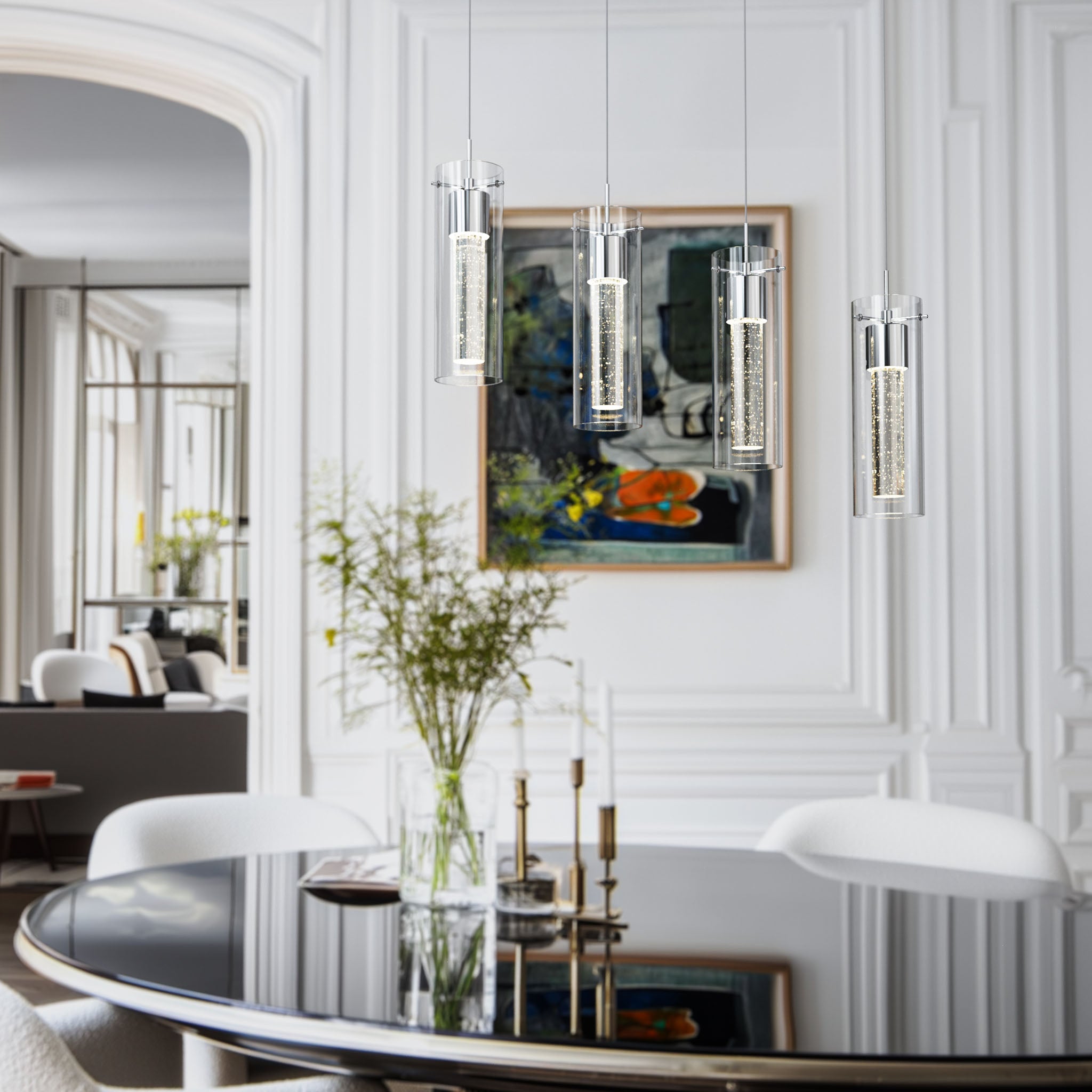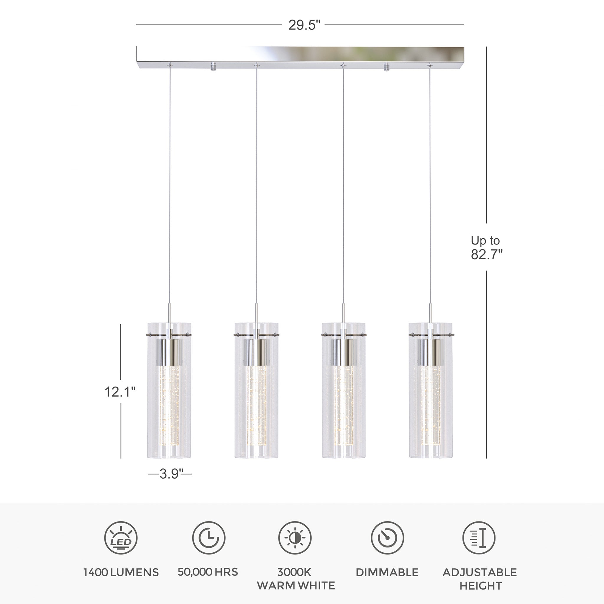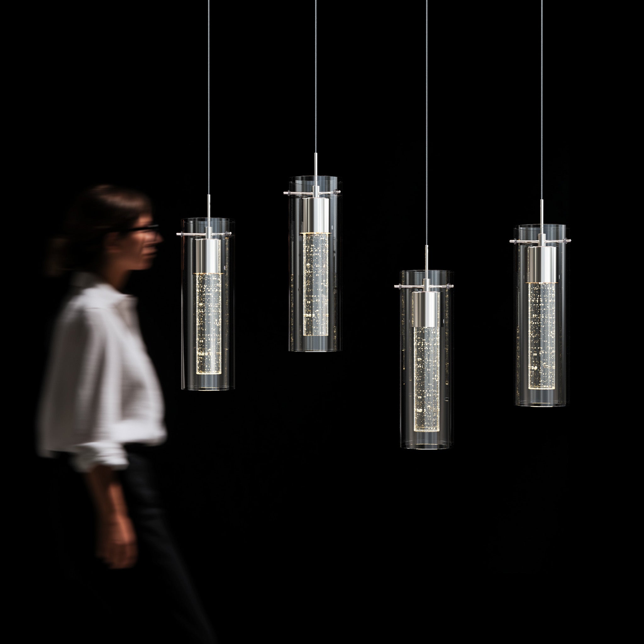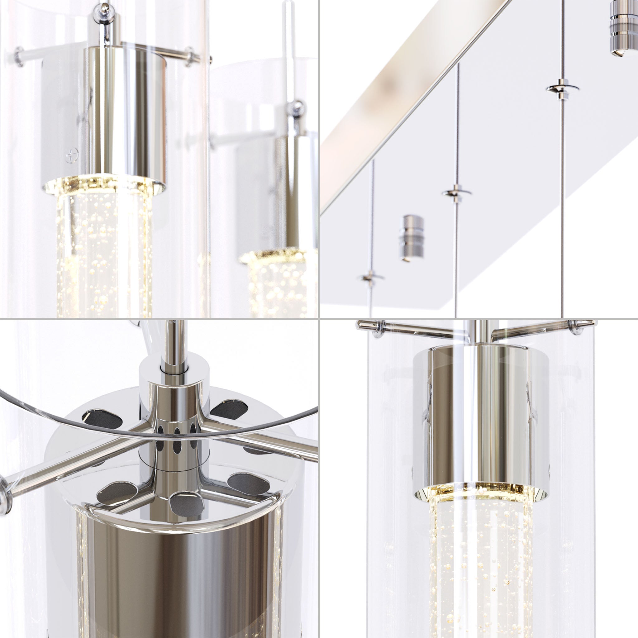Designed for modern interiors seeking clean architectural lines and luminous depth. Finished in elegant polished chrome, this linear island fixture features a dual-glass construction with a clear outer cylinder and a premium bubble glass inner core, creating layered illumination with visual texture.