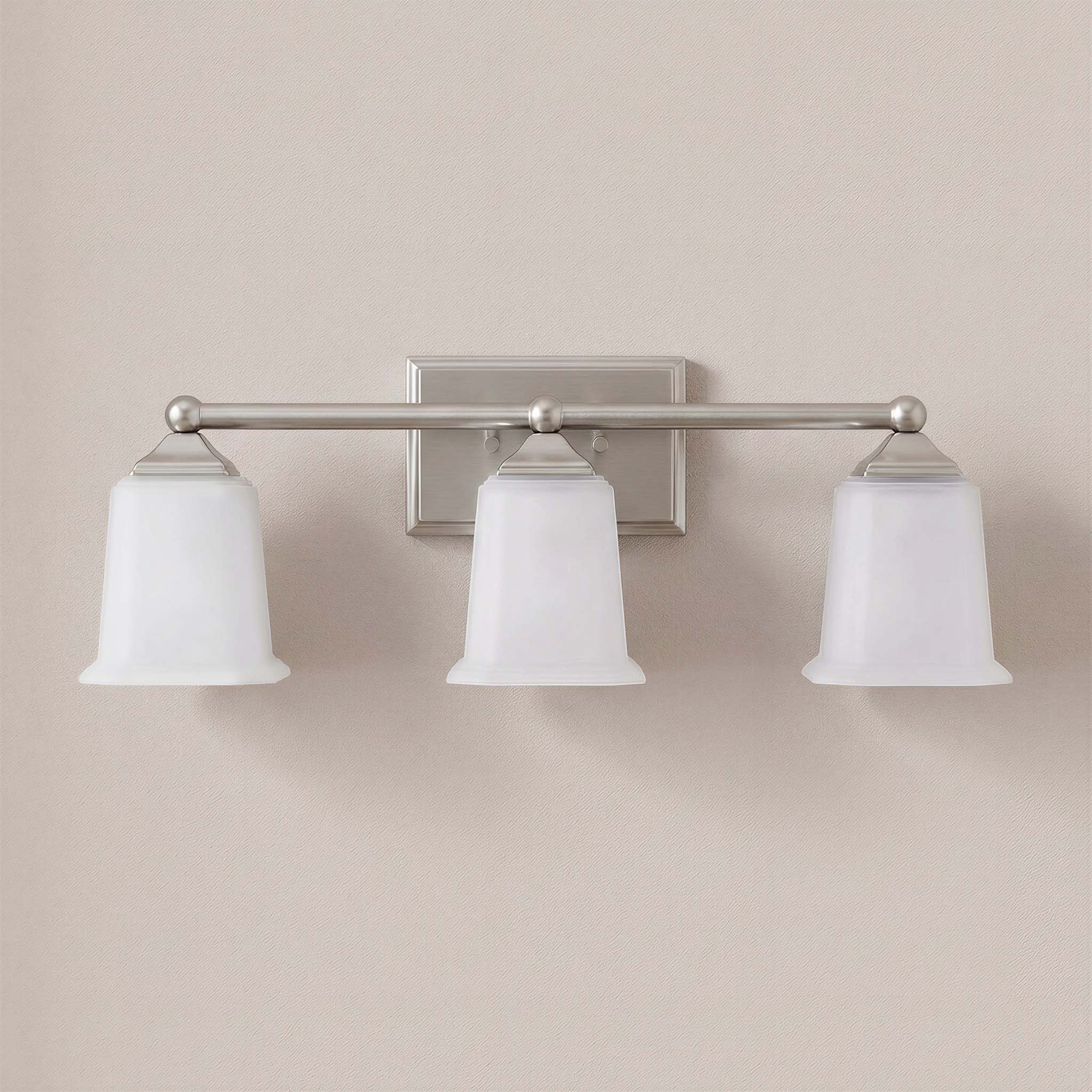 Designed for versatility, this 3-light vanity fixture can be mounted facing upward or downward to suit different lighting preferences and ceiling heights. The neutral brushed nickel finish pairs effortlessly with chrome fixtures, marble countertops, and contemporary cabinetry. It delivers practical task lighting with a refined, minimalist aesthetic.