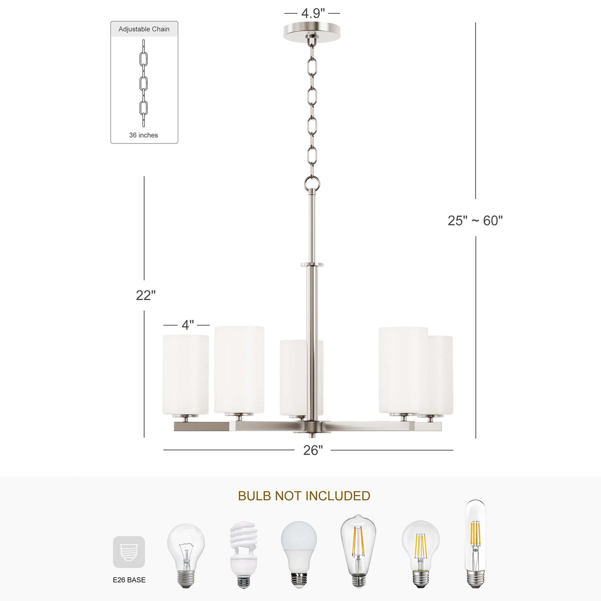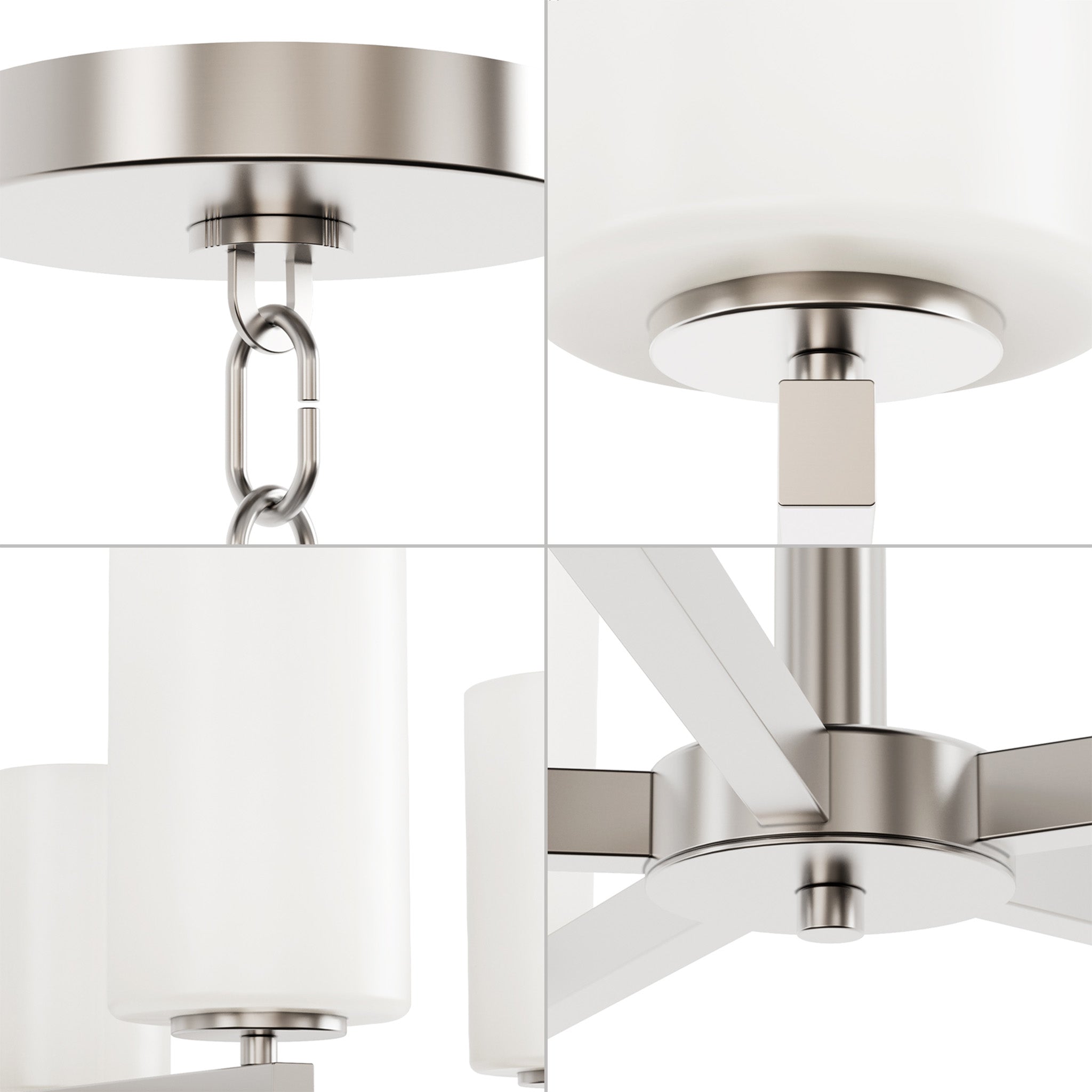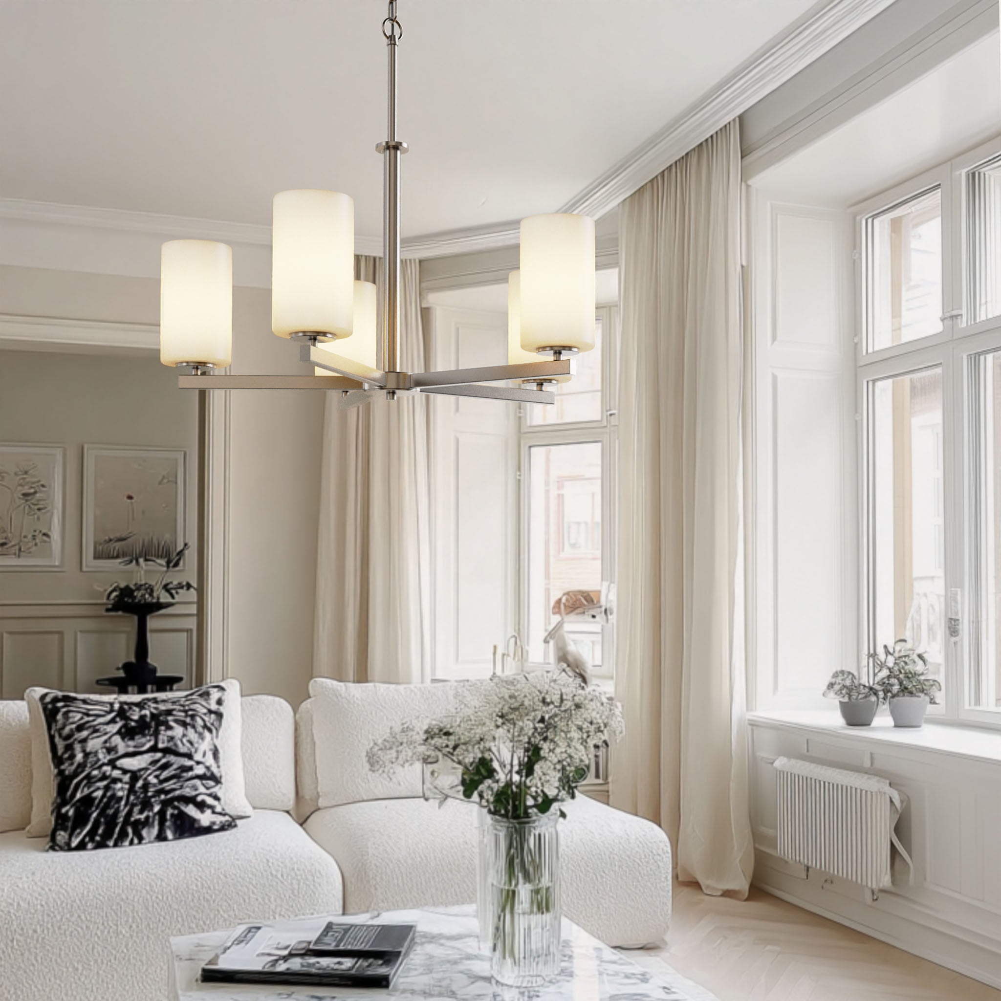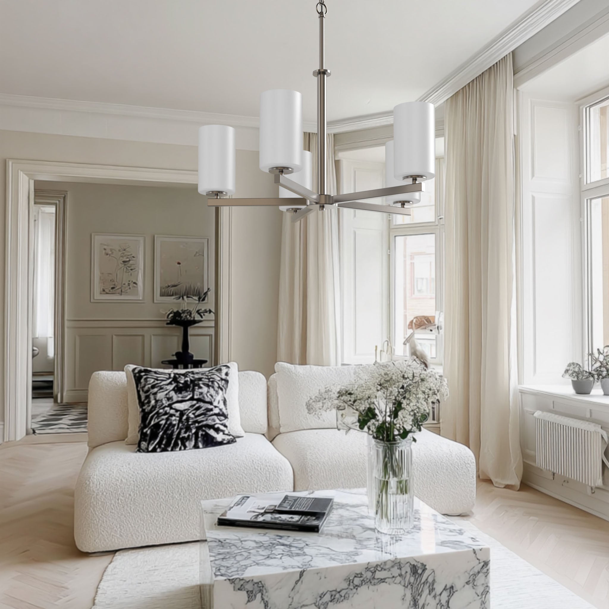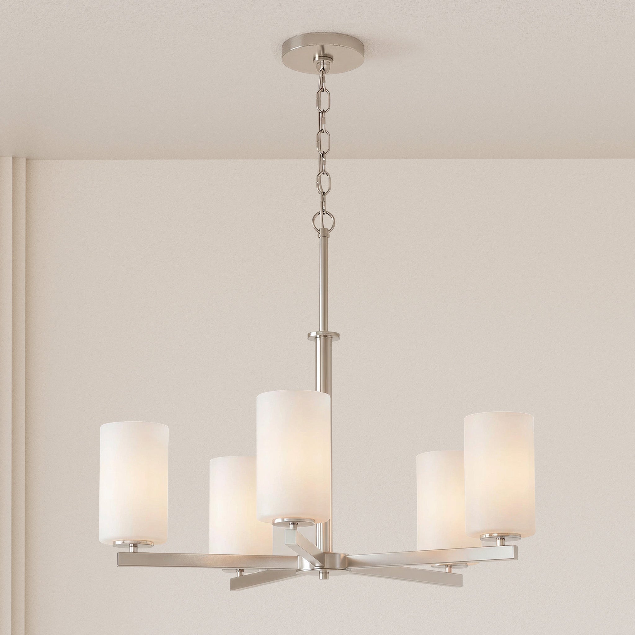 Finished in brushed nickel, the fixture features five evenly spaced arms supporting frosted white glass shades that softly diffuse light without glare. The cylindrical glass forms create a calm visual rhythm, while the streamlined metal structure keeps the overall silhouette light and contemporary.